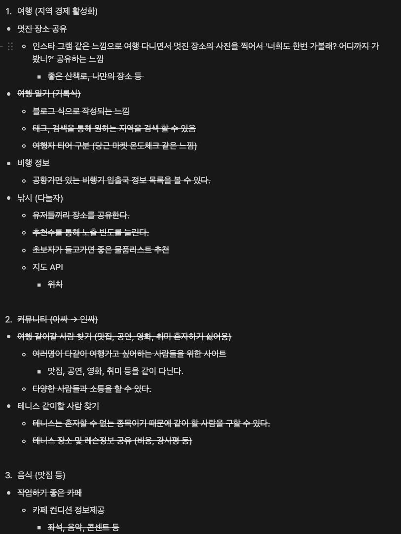 - 큰 주제를 팀원들과 함께 하나씩 던져봤더니 총 16개정도?의 주제가 나왔다.