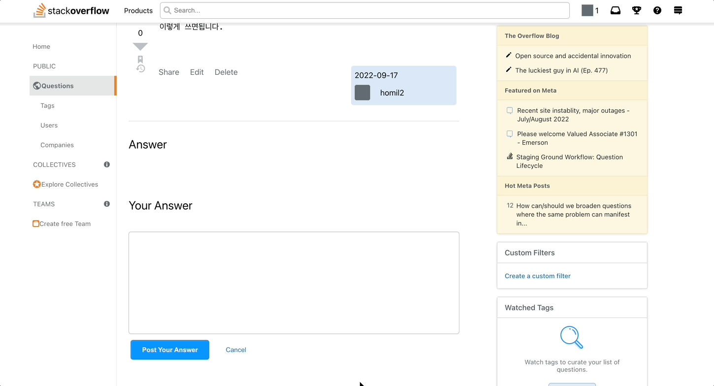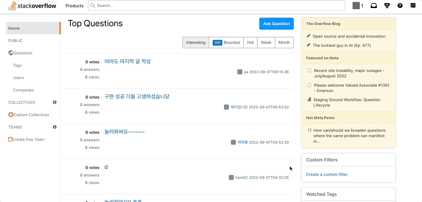 - 스택오버플로우의 모든 기능을 구현하지 못한 것은 아쉽지만 팀원들과 정한 기능은 완벽하게 구현해서 만족스럽다.